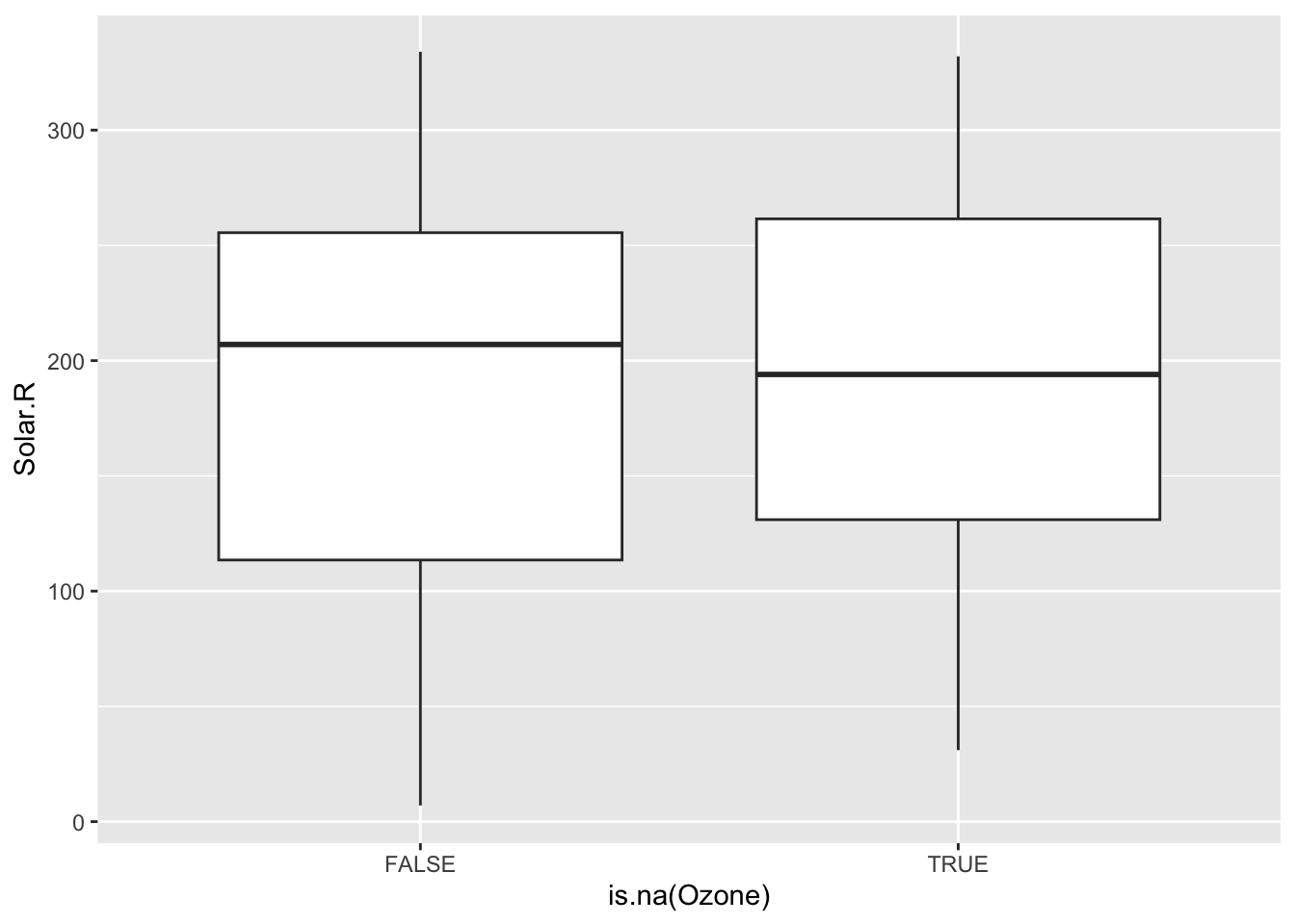 The above boxplots and density plots suggest that missing ozone is not strongly related to solar radiation levels.