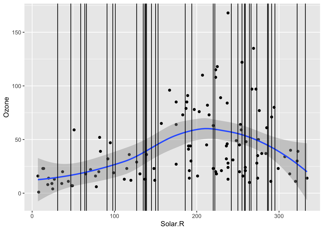 In the scaterrplot below, we look at the relationship between Ozone and Solar.R and use vertical lines to indicate the Solar.R values for cases that are missing Ozone.