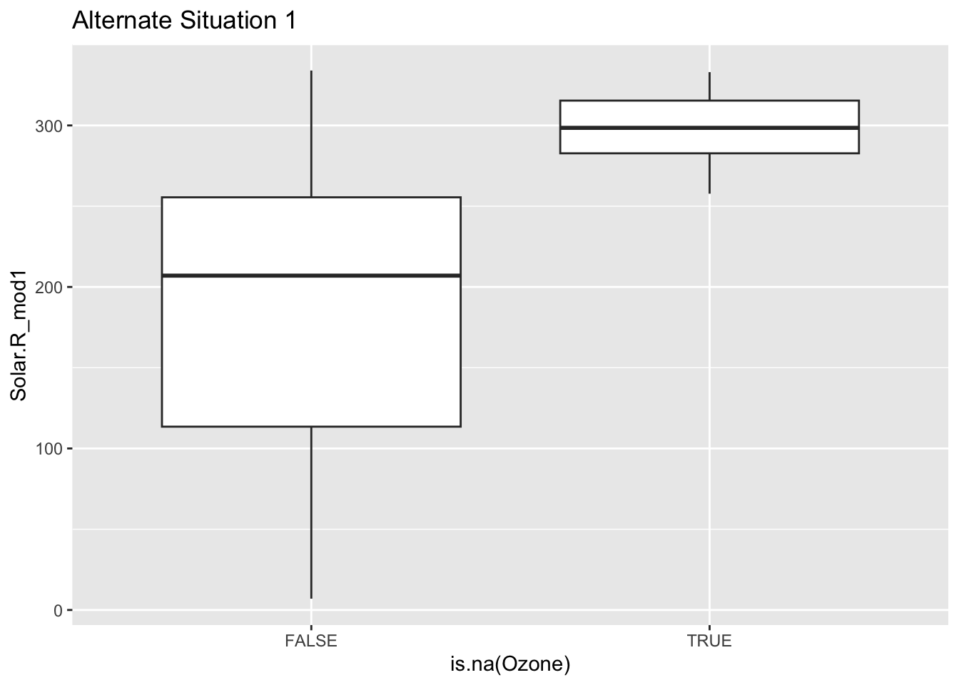 To explore these relationships, we can create TRUE/FALSE indicators of whether a variable is missing. In the plots below, we use is.na(Ozone) to explore whether cases with missing ozone values are noticeably different from cases with observed ozone values in terms of Solar.R.