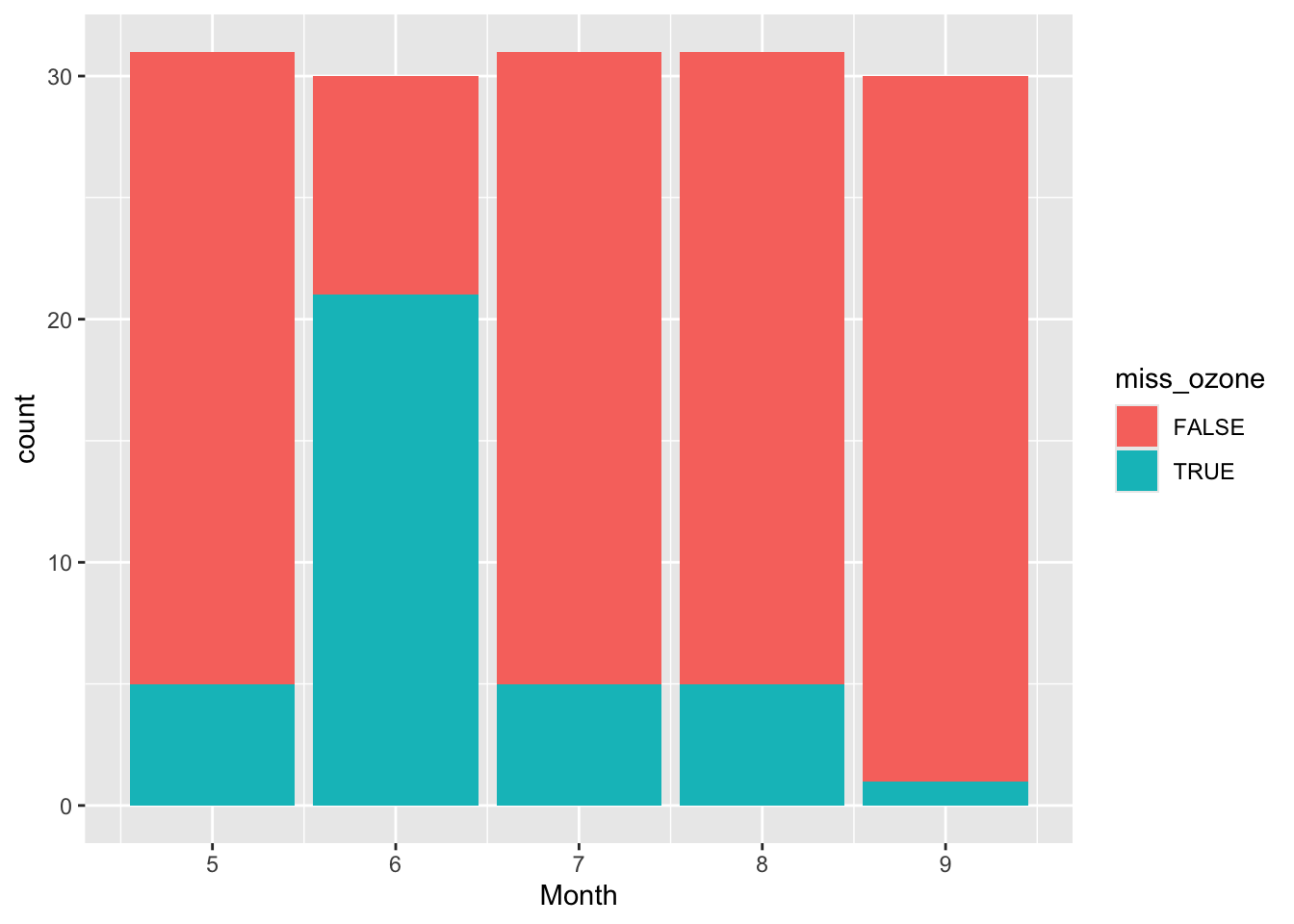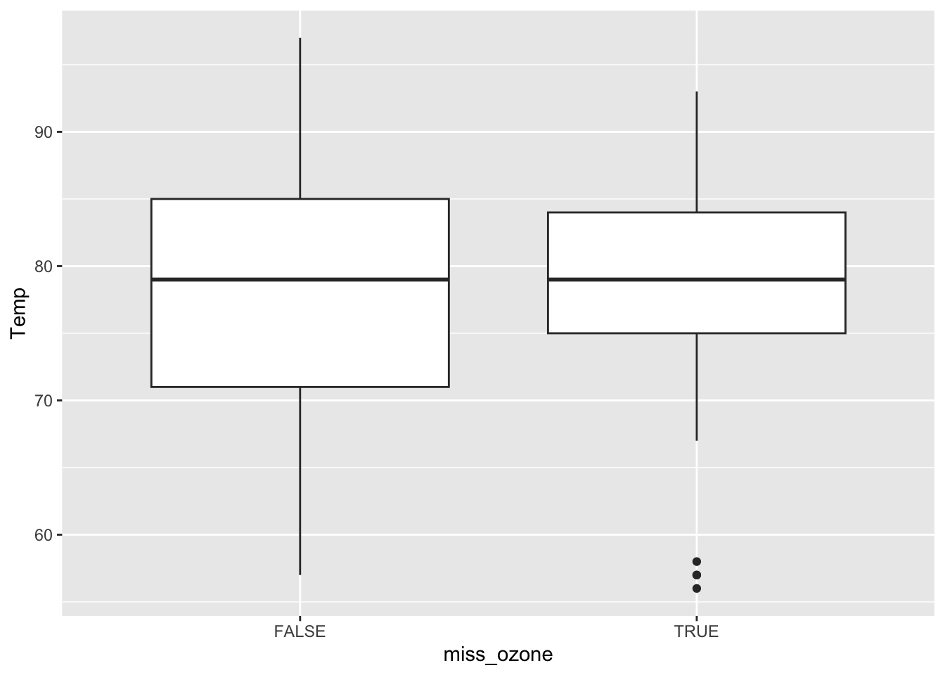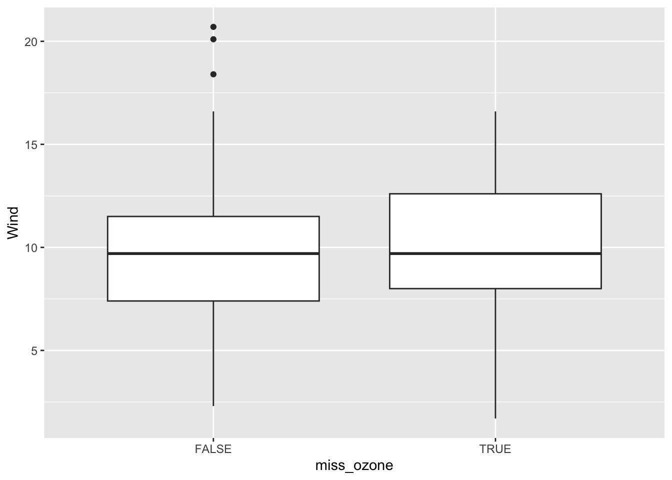 We still should check if ozone missingness is related to the Wind, Temp, Month, and Day variables (to be done in Exercises).