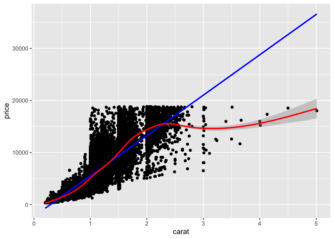 Scatterplot + Smooth function Create a function that creates a scatterplot from a user-supplied dataset with user-supplied x and y variables. The plot should also show a curvy smoothing line in blue, and a linear smoothing line in red. Test your function using the diamonds dataset.