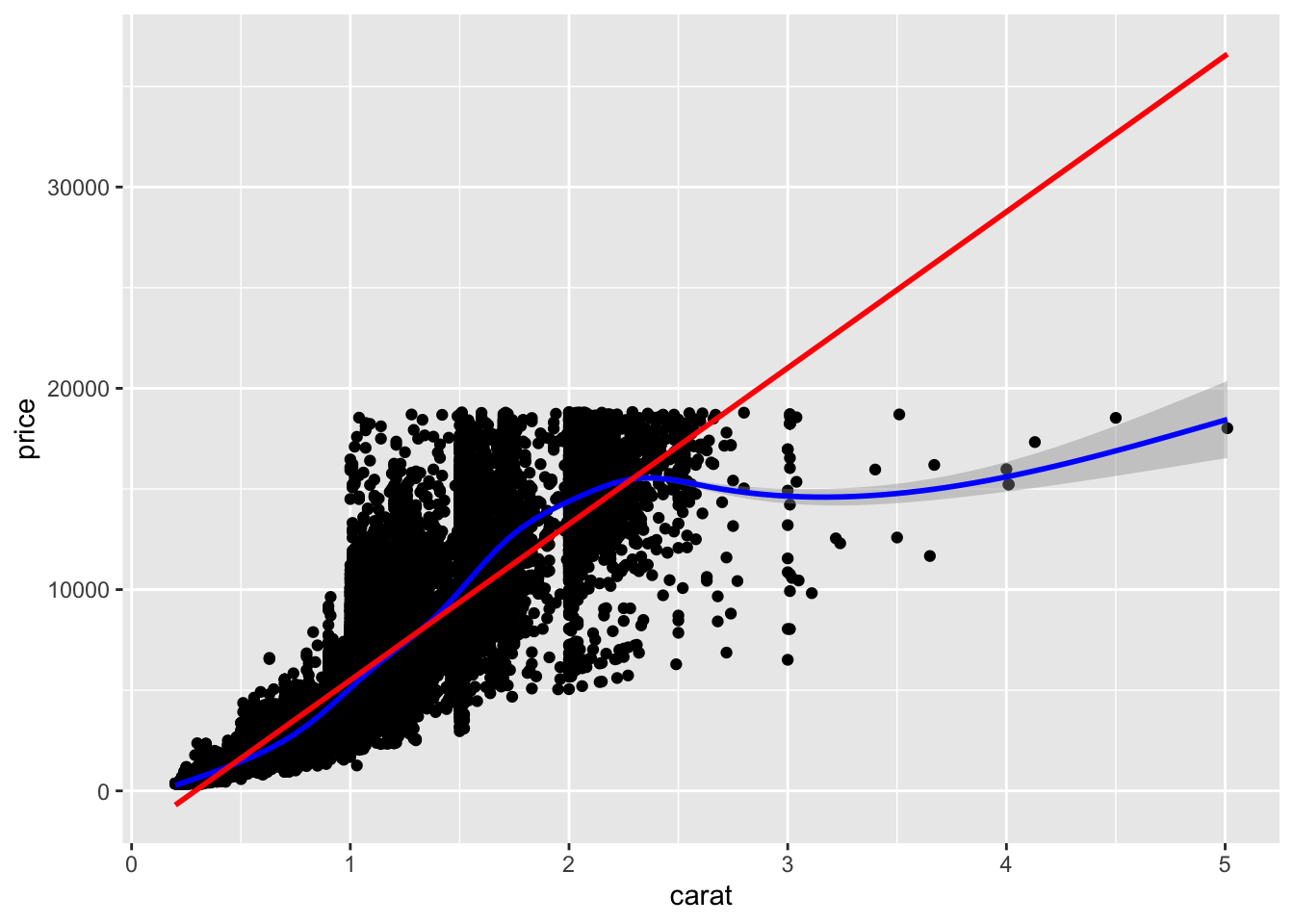 7. **Scatterplot + Smooth function** Create a function that creates a scatterplot from a user-supplied dataset with user-supplied x and y variables. The plot should also show a curvy smoothing line in blue, and a linear smoothing line in red. Test your function using the `diamonds` dataset.