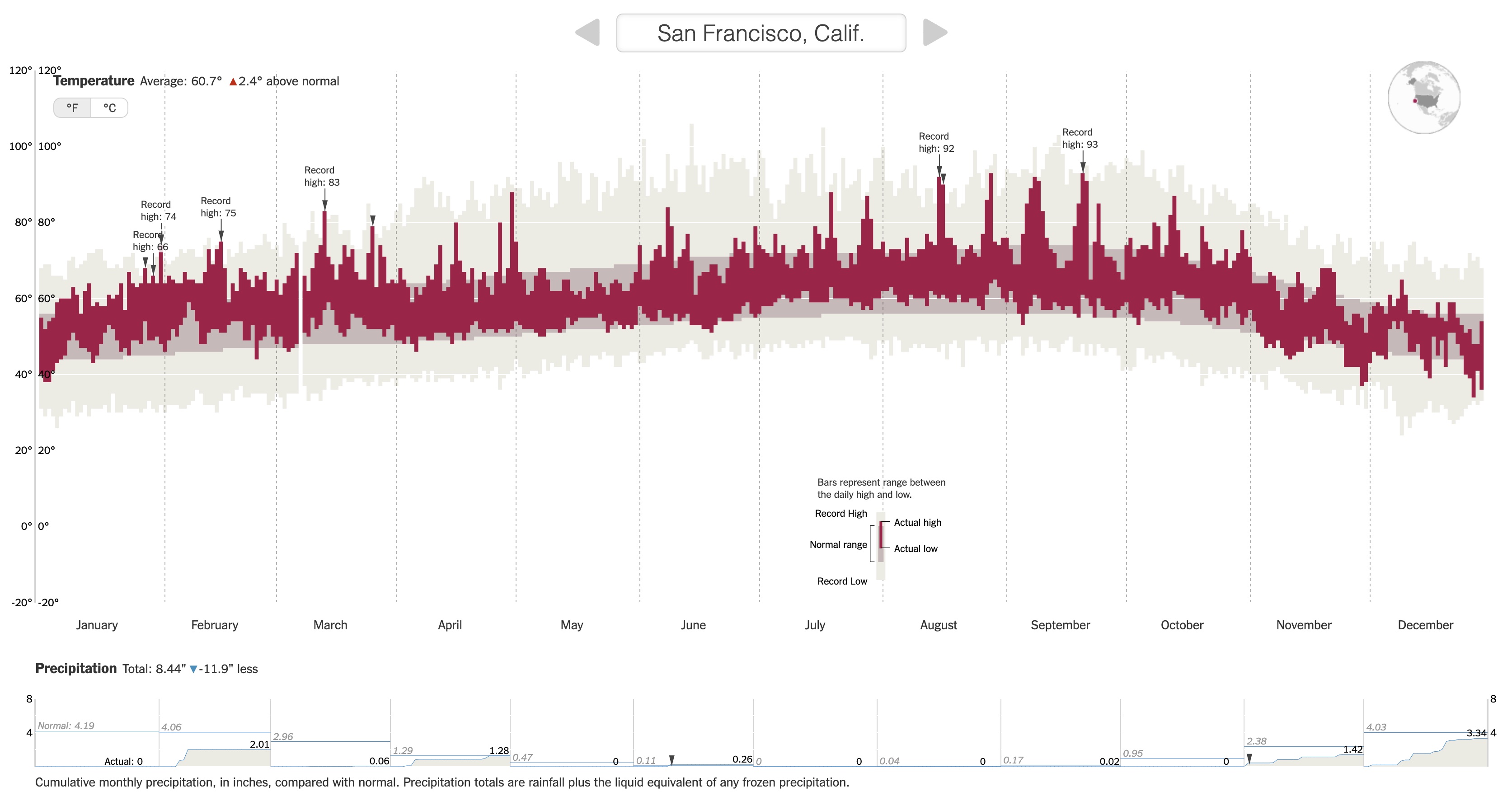 In this lesson, we are going to recreate NYTimes 2015 Temperature Visualization (html) using data from San Francisco (SFO) in 2011.