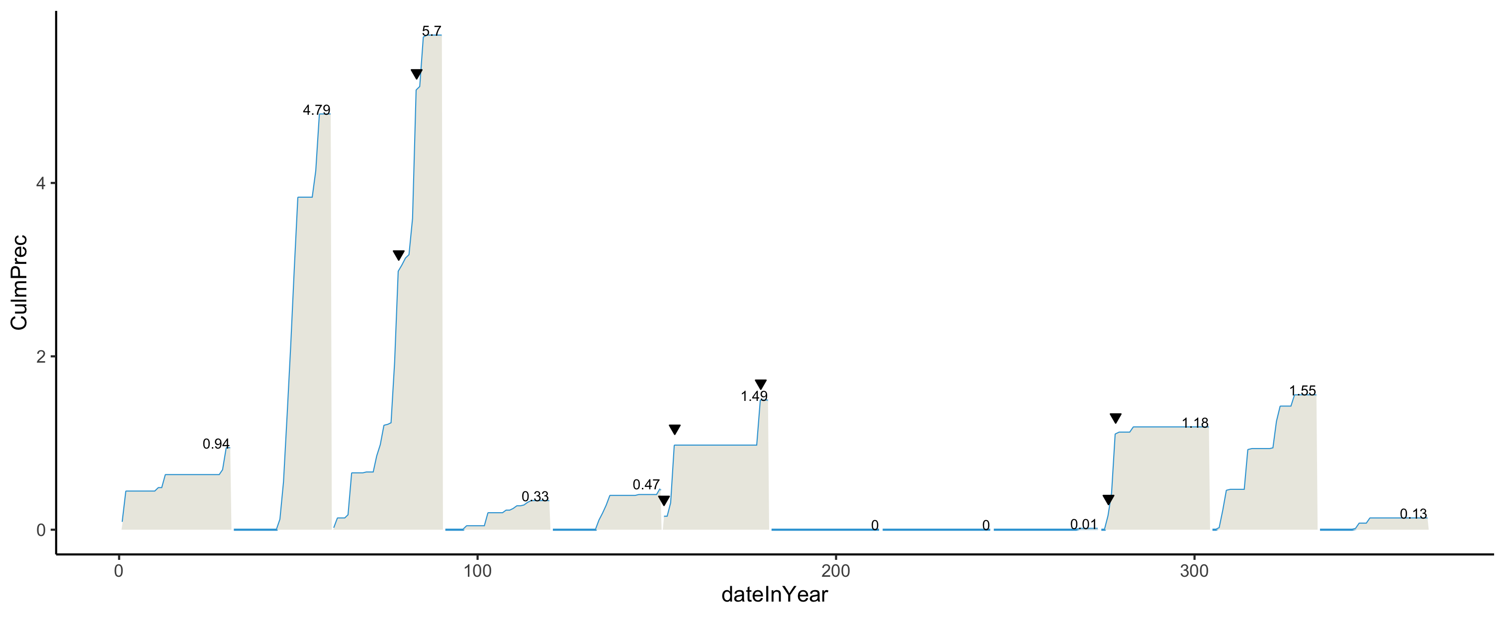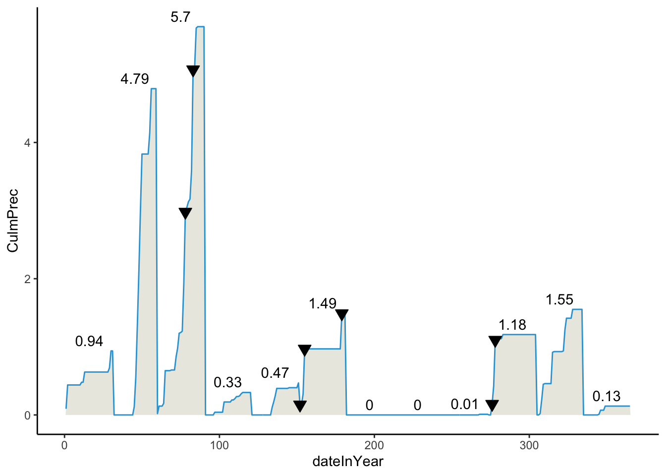 - The triangles point to precipitation records–refer to the data codebook above for the